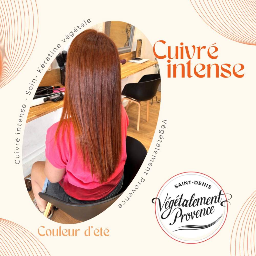Faire une couleur cuivré avec un soin à la kératine végétale dans un salon de coiffure à Possession, la Réunion : cette réalisation met en valeur l’éclat du cuivré associé à la force du végétal, pour un résultat lumineux et soigné. Réalisée par Végétalement Provence - Claire et Séverine, cette prestation illustre un travail précis sur la profondeur du cuivré tout en respectant la fibre capillaire grâce à l’utilisation de produits naturels et végans, sans ammoniaque.